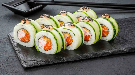 Найпростіші поєднання часто виявляються найсмачнішими. Тут немає складних соусів чи екзотичних добавок — тільки свіже філе лосося, хрусткий огірок, крабовий мікс та рис з норі. Саме ця простота дозволяє повністю розкрити природний смак риби.