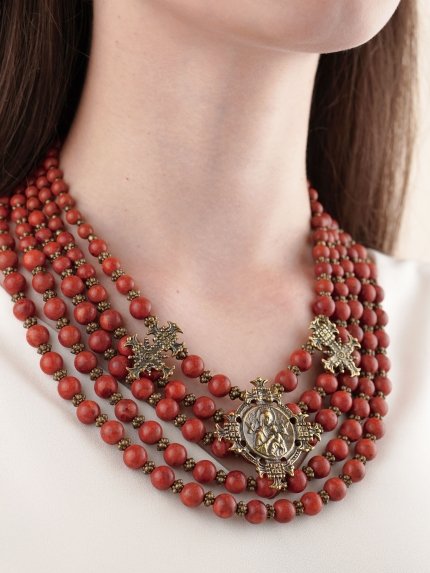 Кожна прикраса створюється з використанням добірних природних матеріалів, де головна роль відведена фактурі та кольору. Особливої уваги заслуговують традиційні коралі, які споконвіку вважалися найдорожчим і найбільш бажаним скарбом в українській жіночій скрині. Ці червоні намистини, що походять із глибоких вод Середземномор’я, втілюють у собі енергію життя, вогню та жіночої сили. В автентичних виробах вони часто поєднуються з металевими згардами, монетами-дукачами чи срібними підвісками, створюючи складні багатоярусні композиції. Такі прикраси є універсальними: вони однаково розкішно виглядають і з класичною білою сорочкою в офісі, і з вечірньою сукнею на урочистій події, і, безумовно, з багатою вишиванкою. Якісна обробка каменю та продумана ергономіка кожного виробу забезпечують не лише естетичну насолоду, а й комфорт при тривалому носінні.