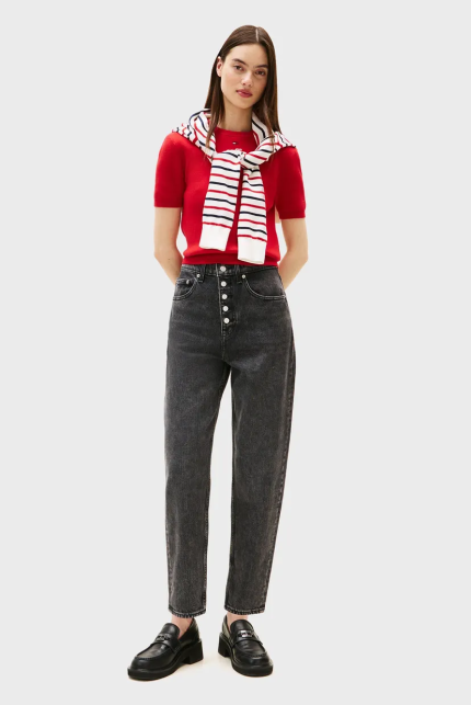 - Для сочетания с мом-джинсами рекомендуется выбирать объемные свитера, строгие рубашки и топы в бельевом стиле, обеспечивая баланс в образе